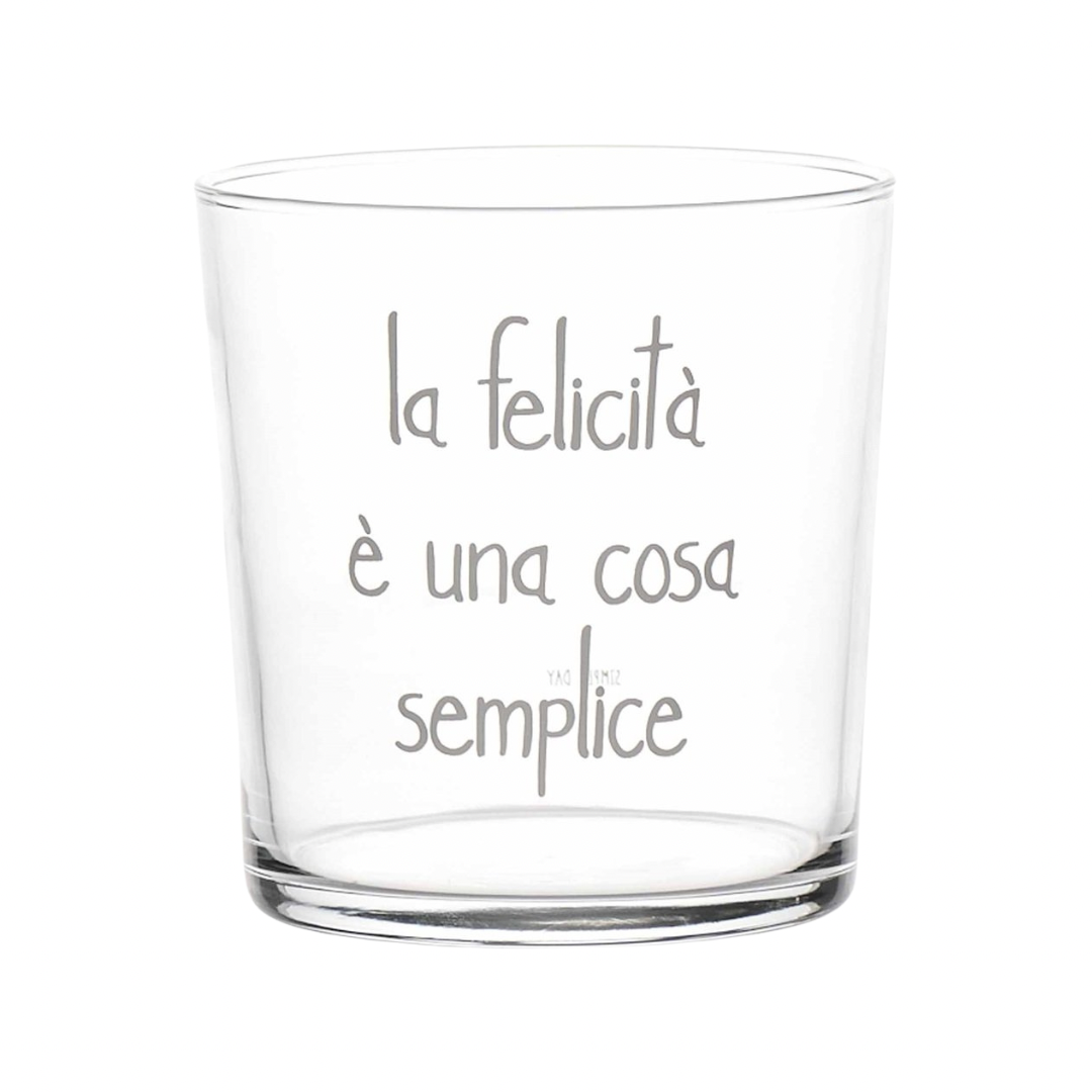 Bicchiere con decoro serigrafato La felicità è una cosa semplice in colore bianco.