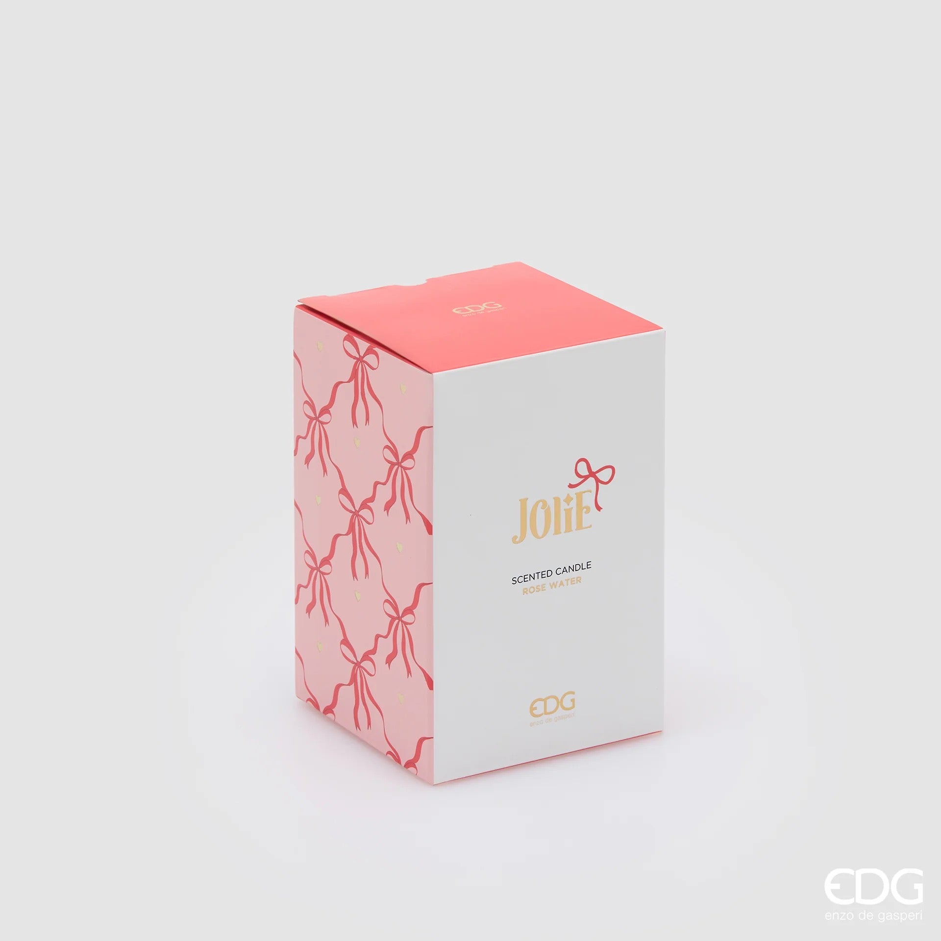 Candela con fragranza Rose water disponibile da 310 gr. o da 115 gr contenuta in un simpatico ed elegante contenitore rosa con fiocco color oro.