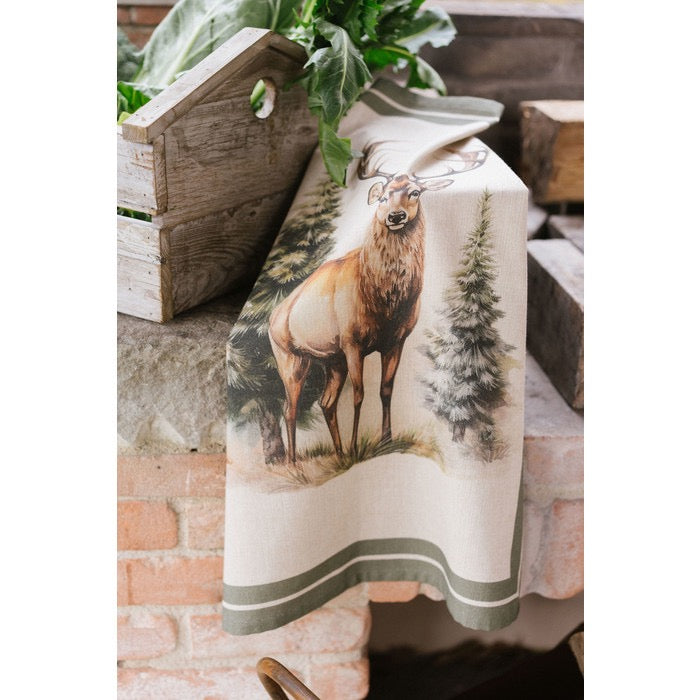 Canovaccio decorato da una graziosa stampa della collezione Bosco Incantato di Nuvole di Stoffa con alberi e cervo.