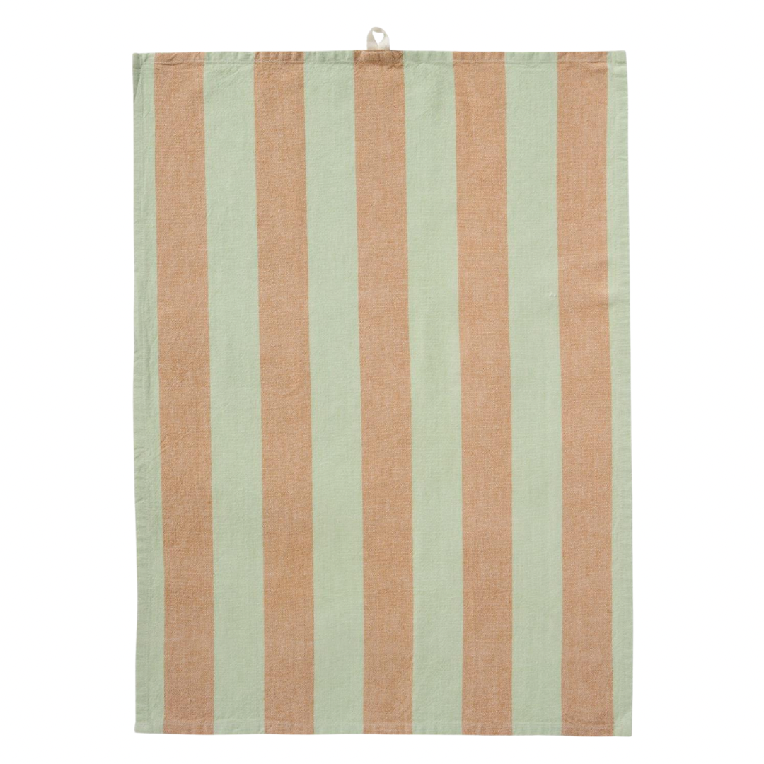 Bellissimo strofinaccio da cucina con strisce larghe verticali di colore verdi e marrone chiaro, di Ib laursen.