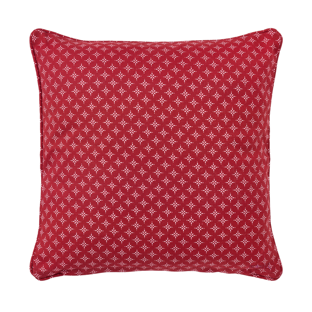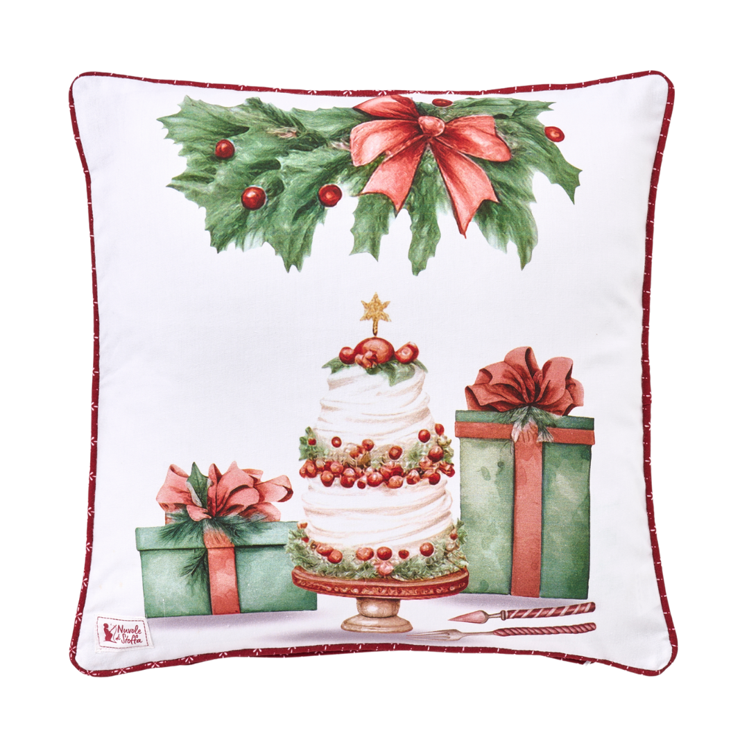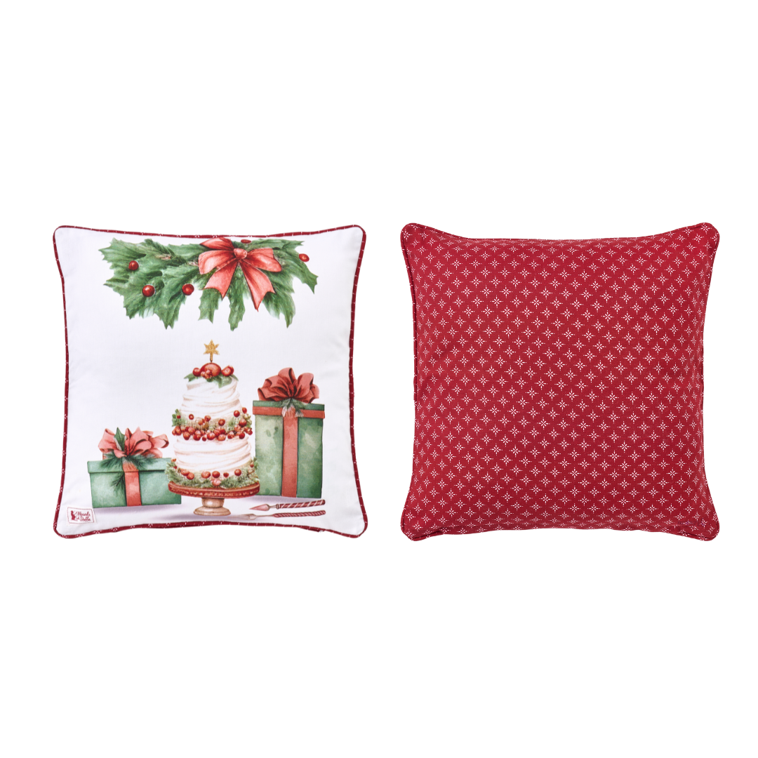 Cuscino della collezione Storia di Natale di Nuvole di Stoffa, da un lato decorato da una deliziosa stampa e dall' altra in colore rosso e bianco.