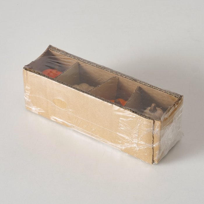 Confezione formata da 4 piccole zucche decorative assortite nella forma e nel colore opaco (arancio e beige).