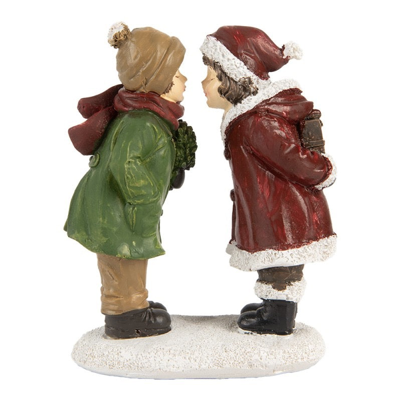 Una bella decorazione natalizia raffigurante due bambini con doni che porta un'atmosfera festosa durante i giorni invernali.