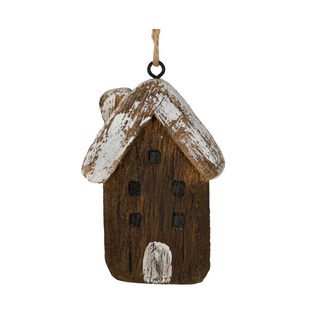 Decorazione da appendere raffigurante una casetta in stile rustico, in color naturale e bianco, ideale per decorare l'albero o più semplicemente da utilizzare come decorazione per la casa durante tutto l' anno.