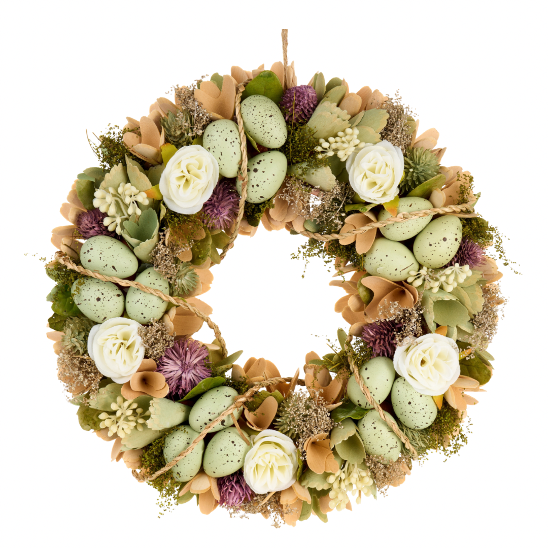 Ghirlanda di fiorellini, foglioline e uova, nei toni del verde, naturale e lilla, con cordino per poterla appendere, della Pepen Collection di Nuvole di Stoffa.