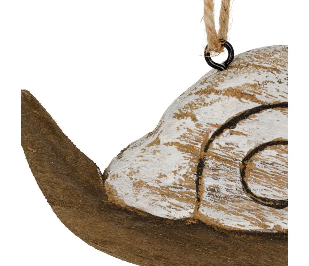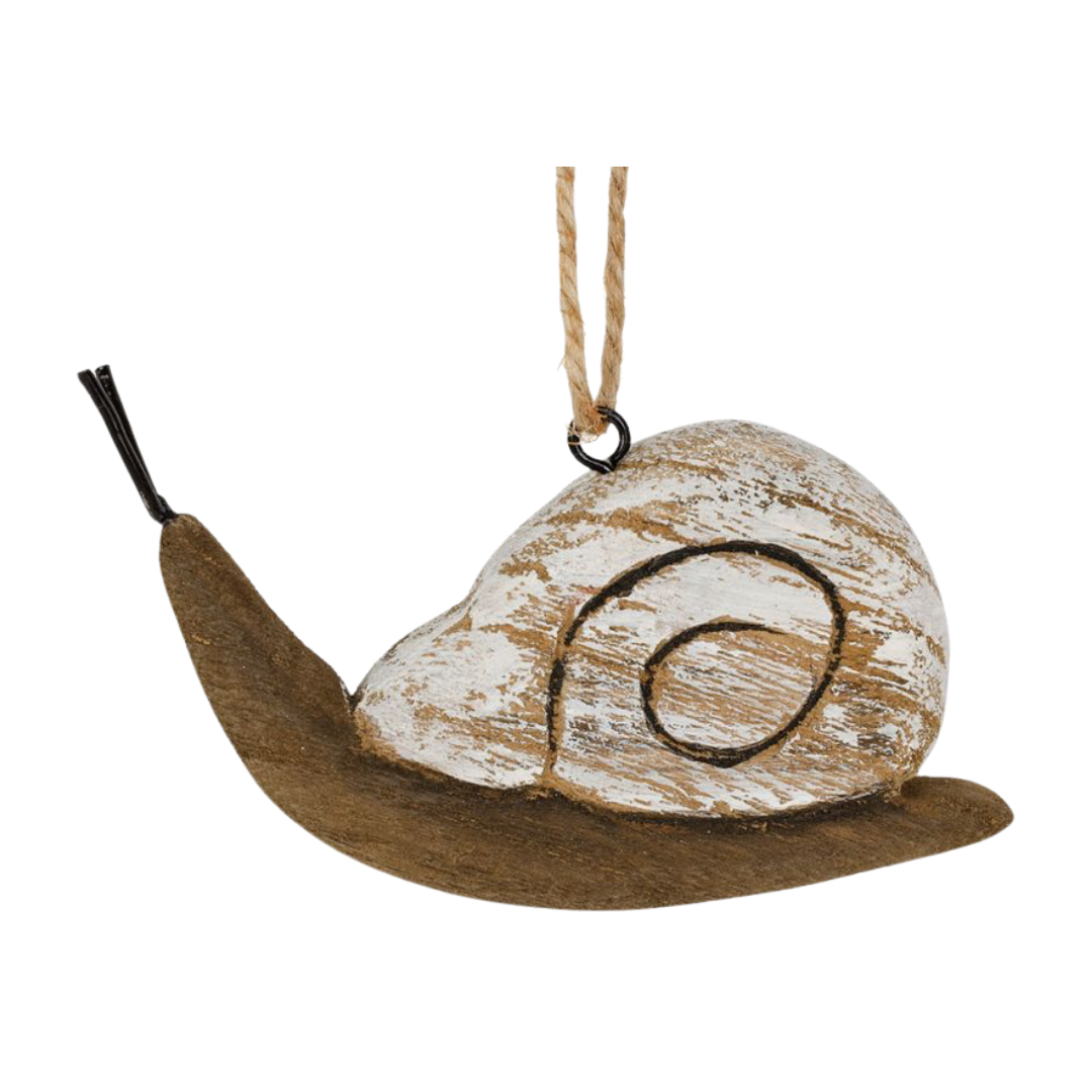 Decorazione da appendere raffigurante una lumaca in stile rustico, in color naturale sbiancata, ideale per decorare l'albero o più semplicemente da utilizzare come decorazione per la casa durante tutto l' anno.