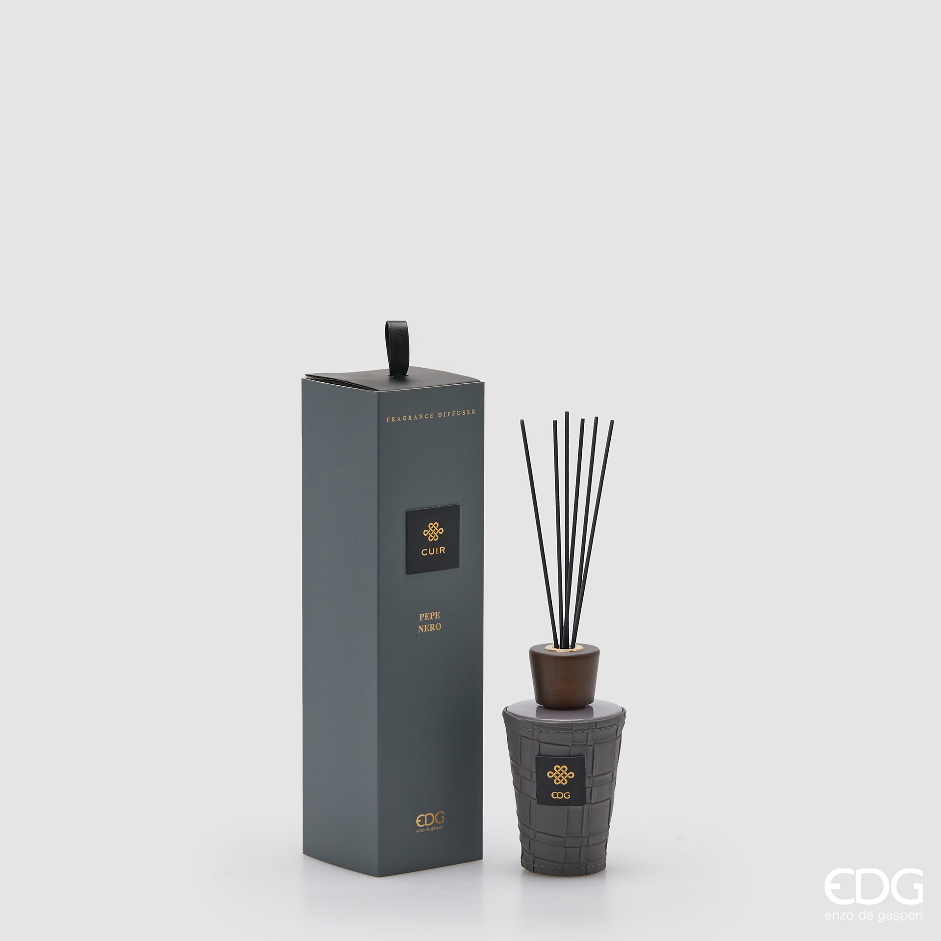L' elegante diffusore, con fragranza black pepper nella inconfondibile bottiglia decorata EDG, intrecciata effetto cuoio, è disponibile nel formato da 150 ml o 300 ml.