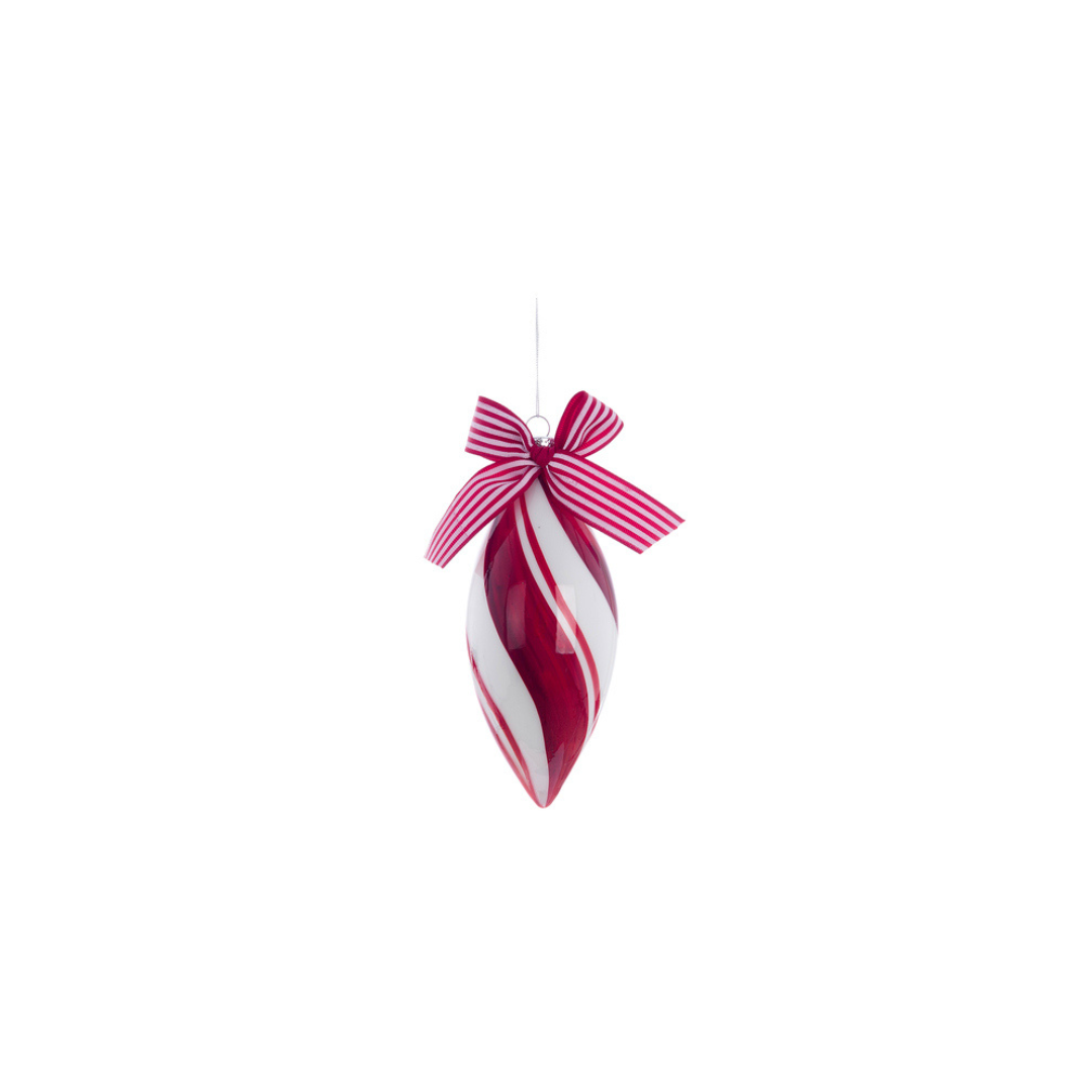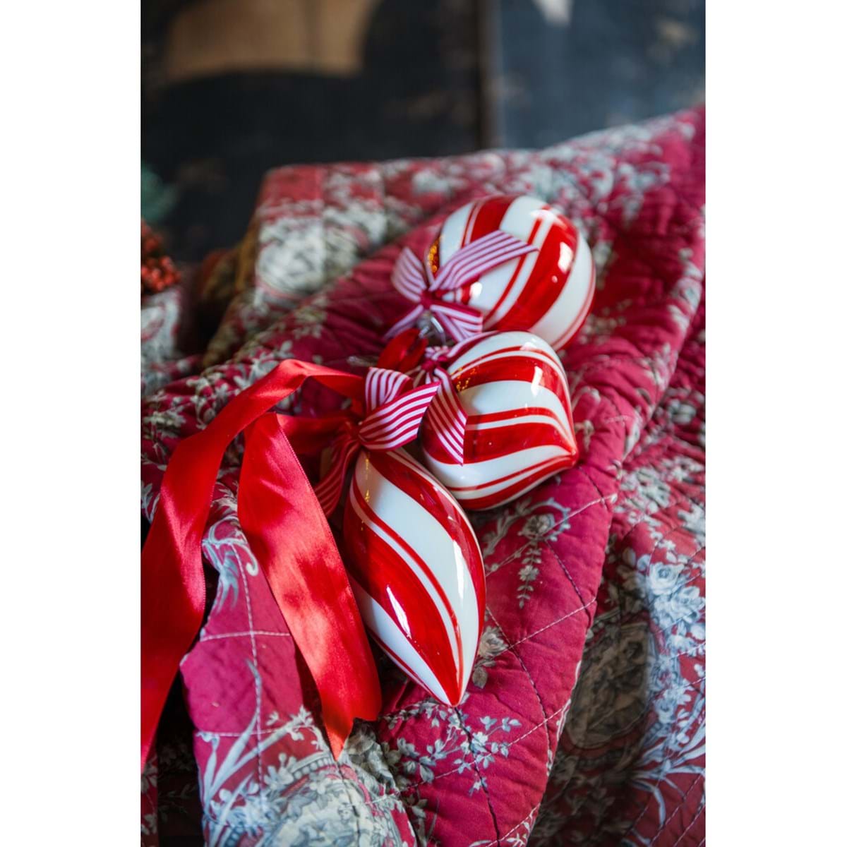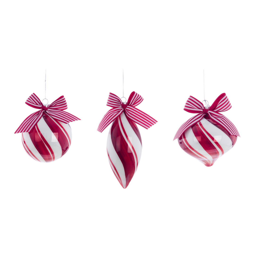 Tre eleganti decorazioni dai colori rosso e bianco impreziosite da un fiocco a righe, nella parte superiore.