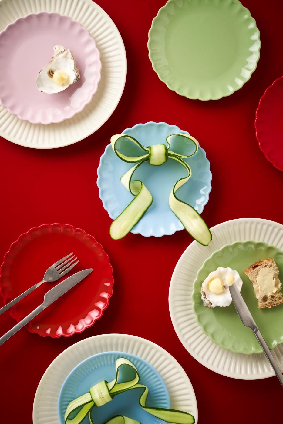 Piatto rotondo dal bordo ondulato, di colore fragola, di Ib Laursen.