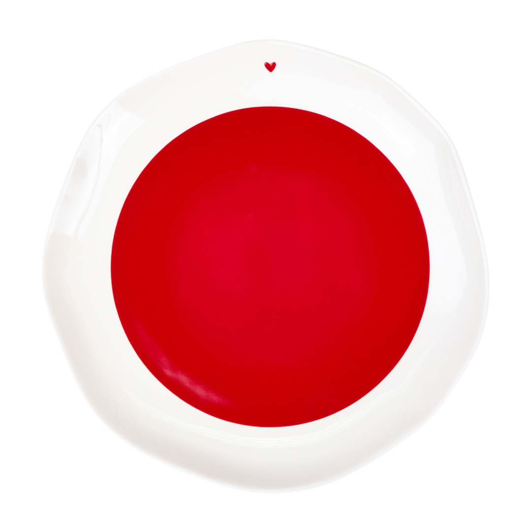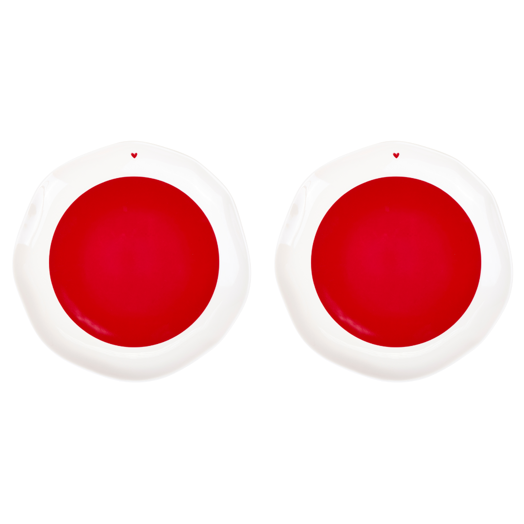 Set di 2 piatti piani dal bordo ondulato, di colore rosso e bianco con cuoricino, di Nuvole di Stoffa, con scatola regalo.