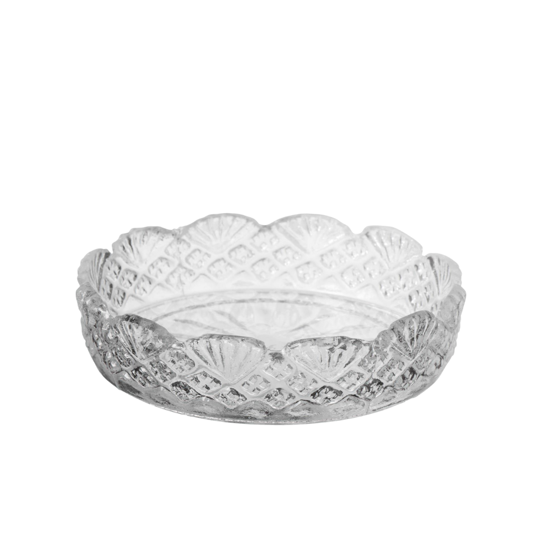 Piattino in vetro trasparente con un elegante motivo a rilievo.