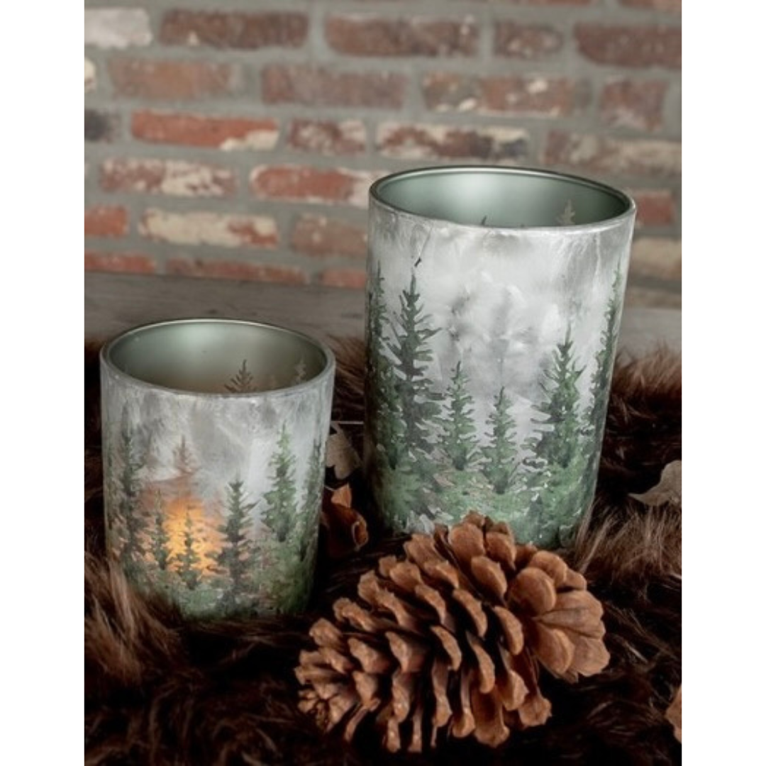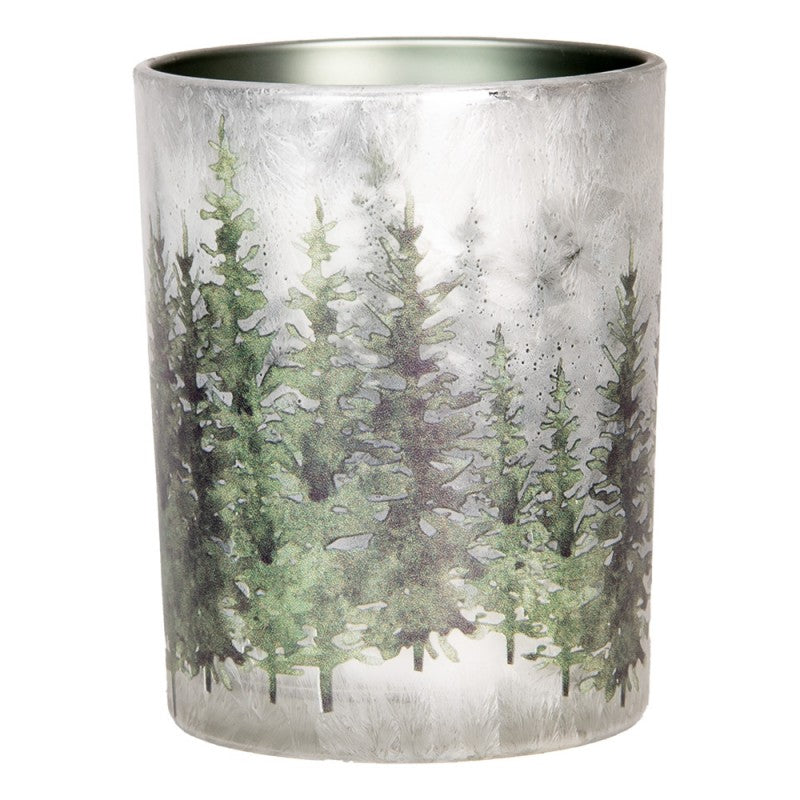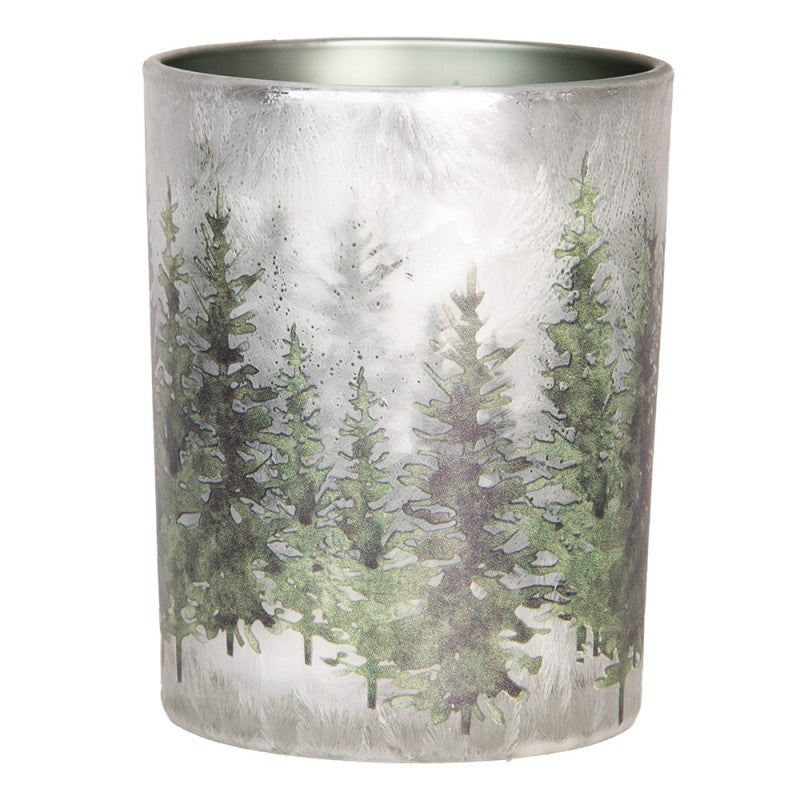Portacandele in vetro satinato, stampato con un motivo di alberi.