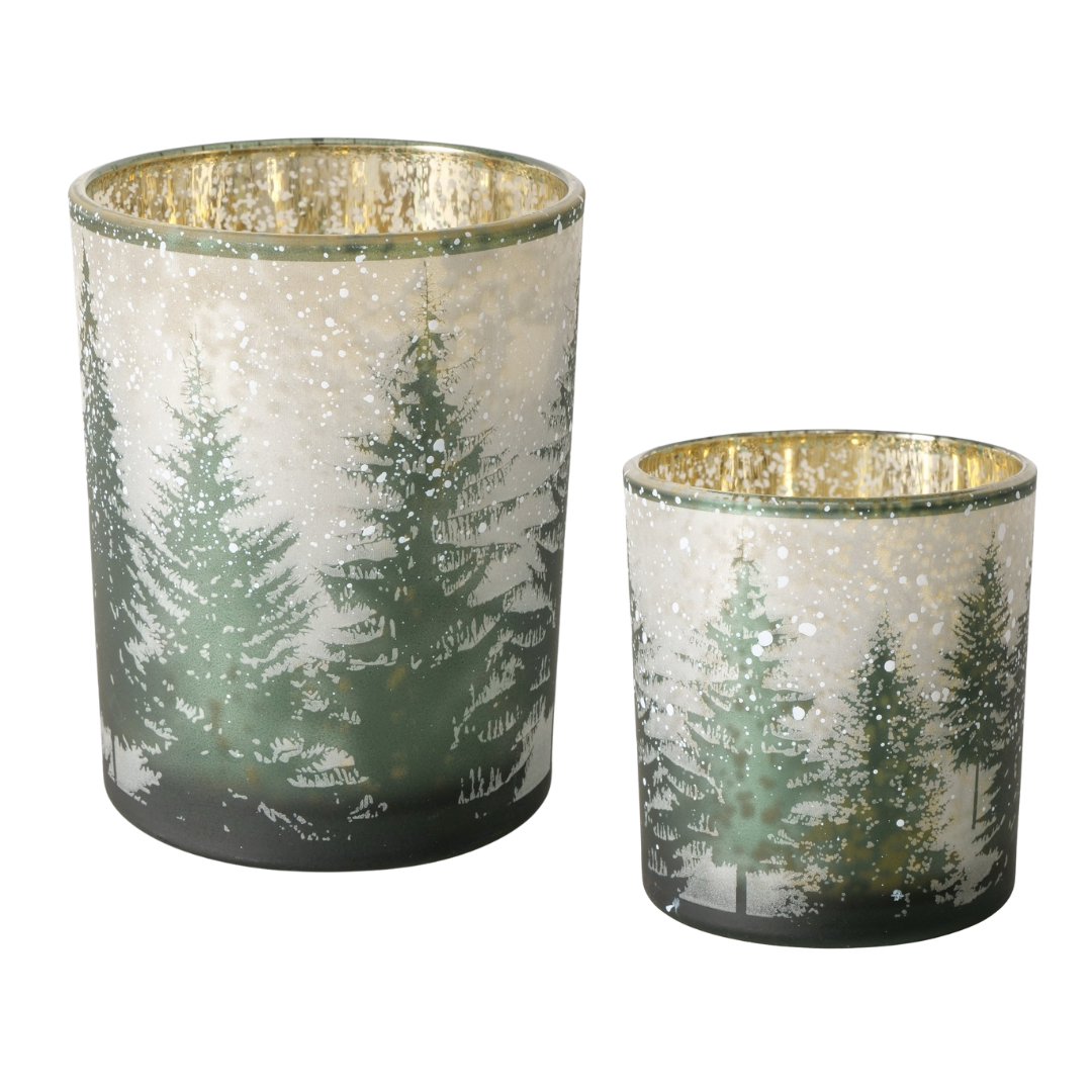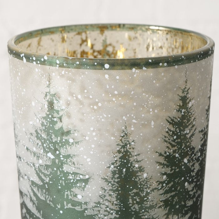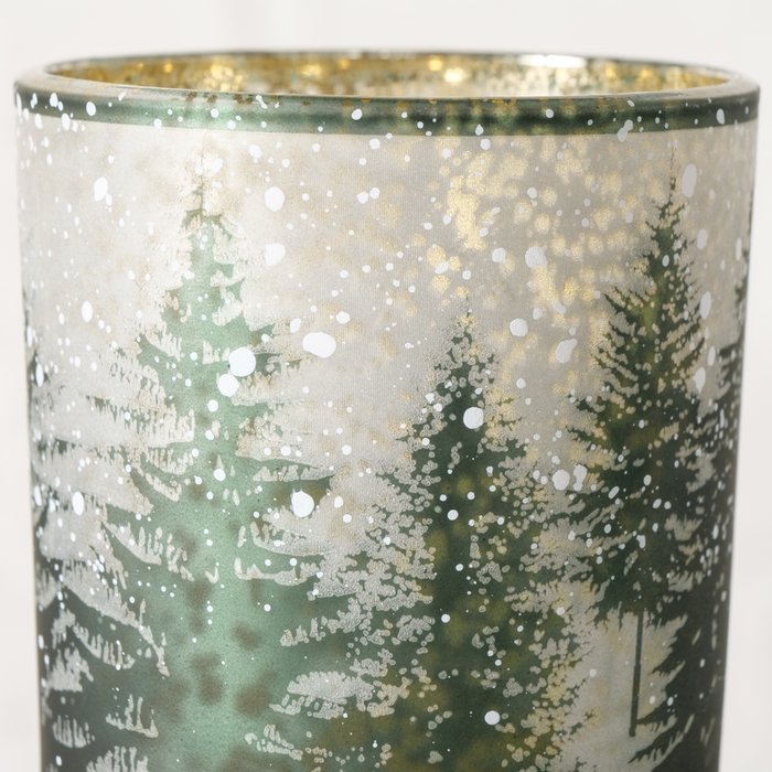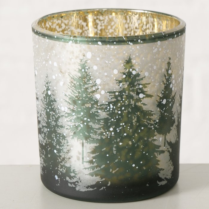 Portacandele in vetro satinato, stampato con un motivo di alberi.