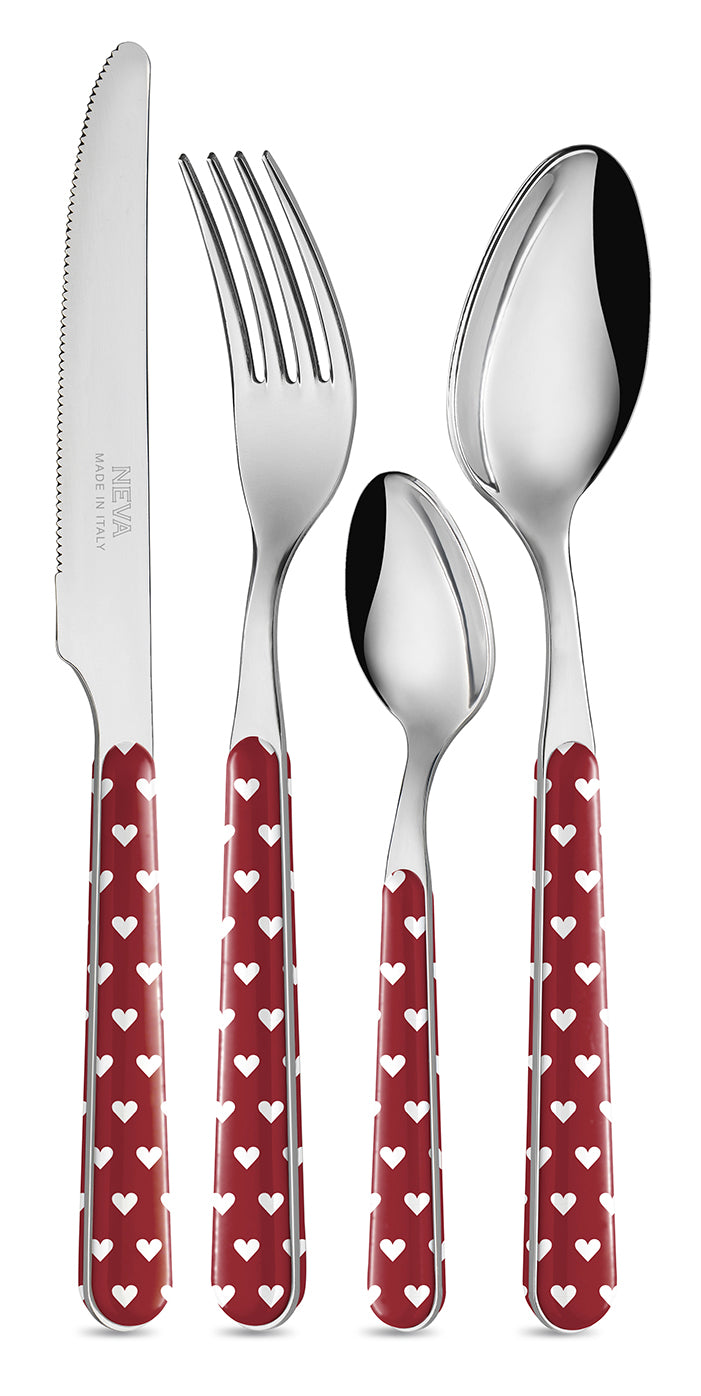 Posate in acciaio inox della collezione Cuoricini. Prodotto made in Italy. Manicatura sandwich in abs colorato. Lavabile in lavastoviglie.