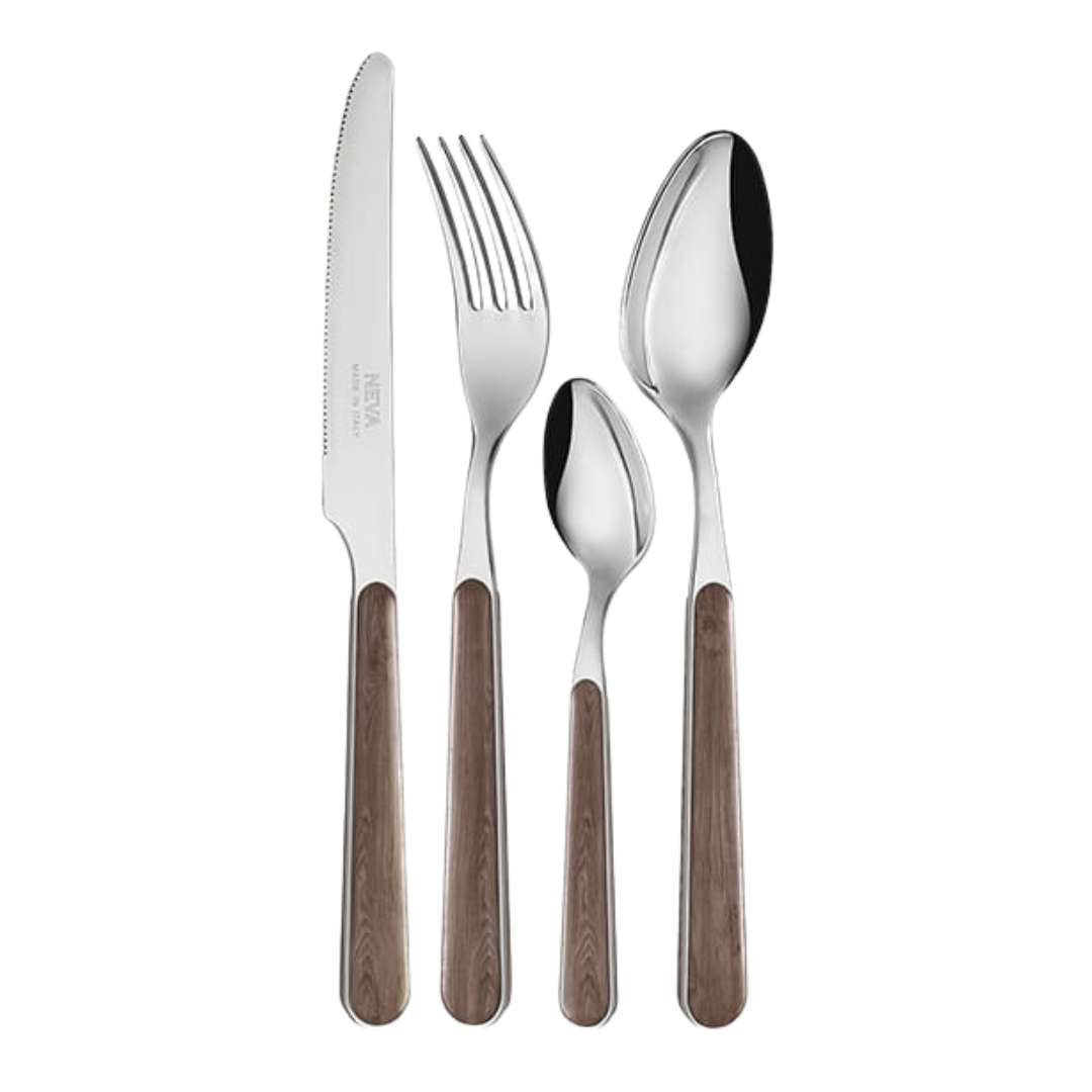 Acciaio inossidabile e manicatura decorata in sublimazione indelebile effetto legno, garantita al lavaggio in lavastoviglie.