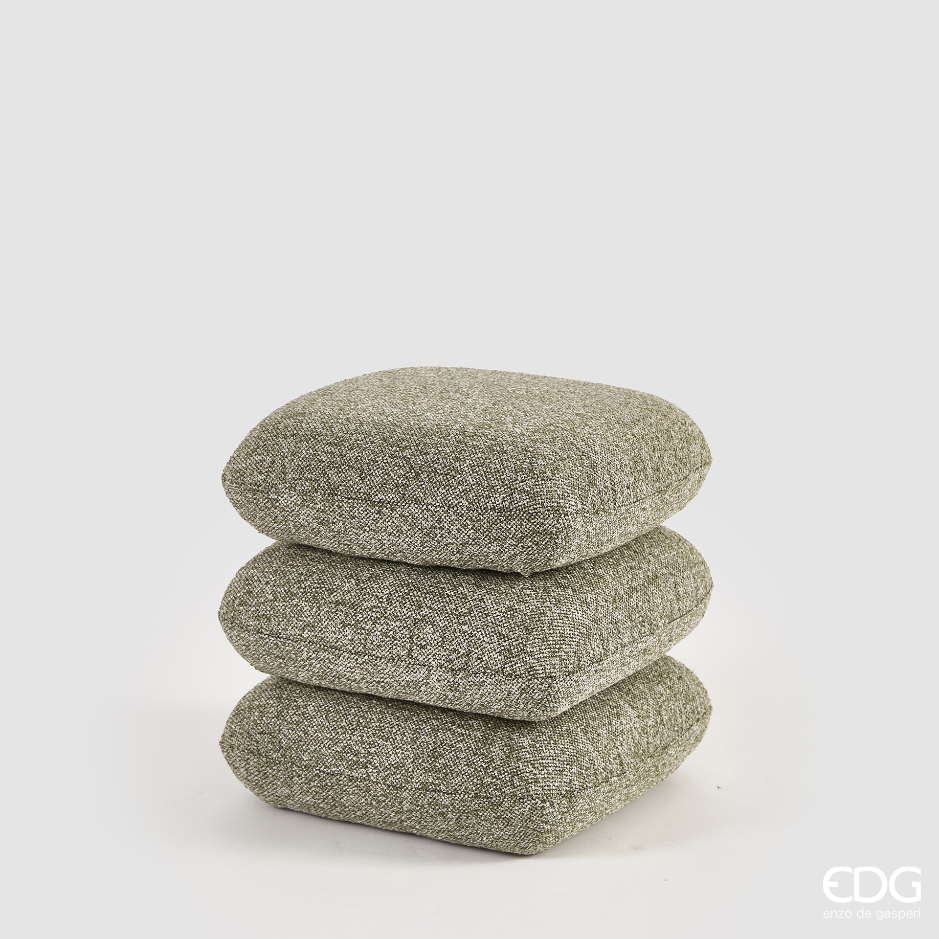 Pouf con struttura rotante in legno e rivestimento in tessuto in colore verde salvia, di Enzo De Gasperi.