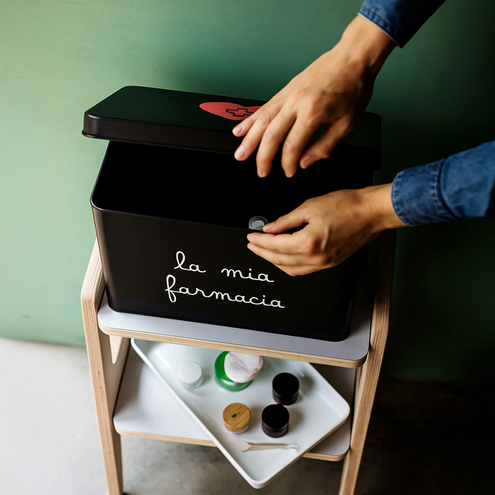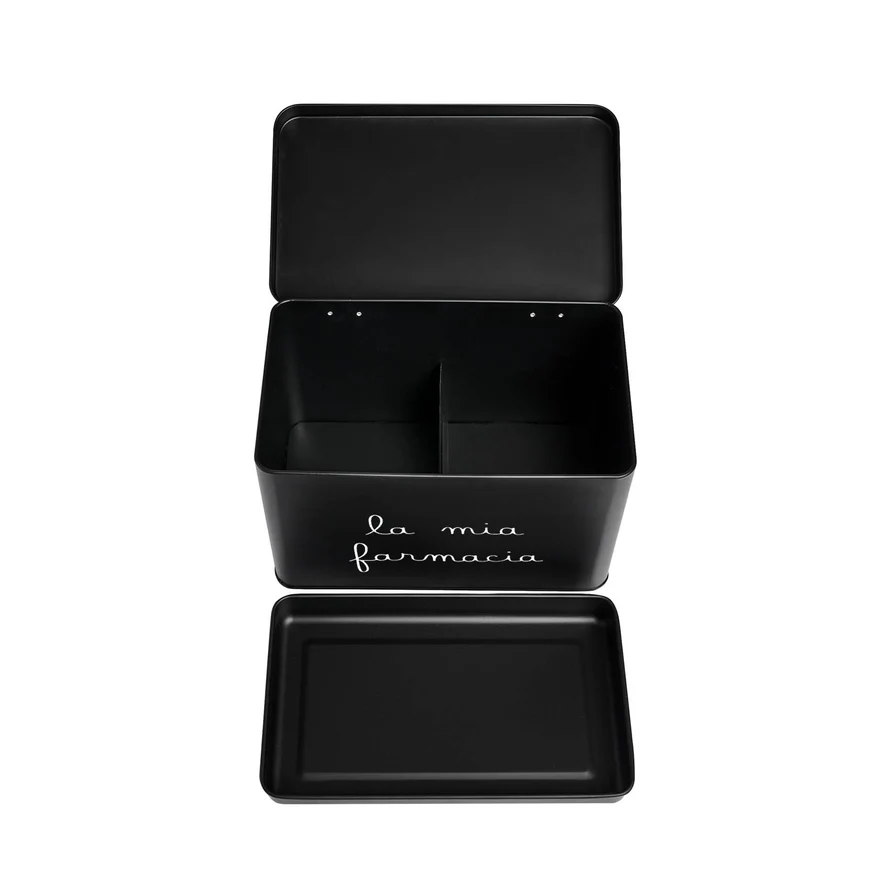 Scatola in acciaio verniciato decoro La mia farmacia, in colore nero, con pratici scomparti interni.