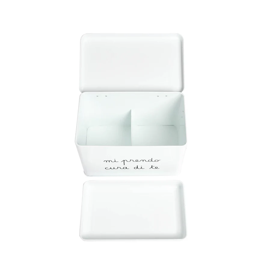 Scatola in acciaio verniciato decoro Mi prendo cura di te, in colore bianco, con pratici scomparti interni.