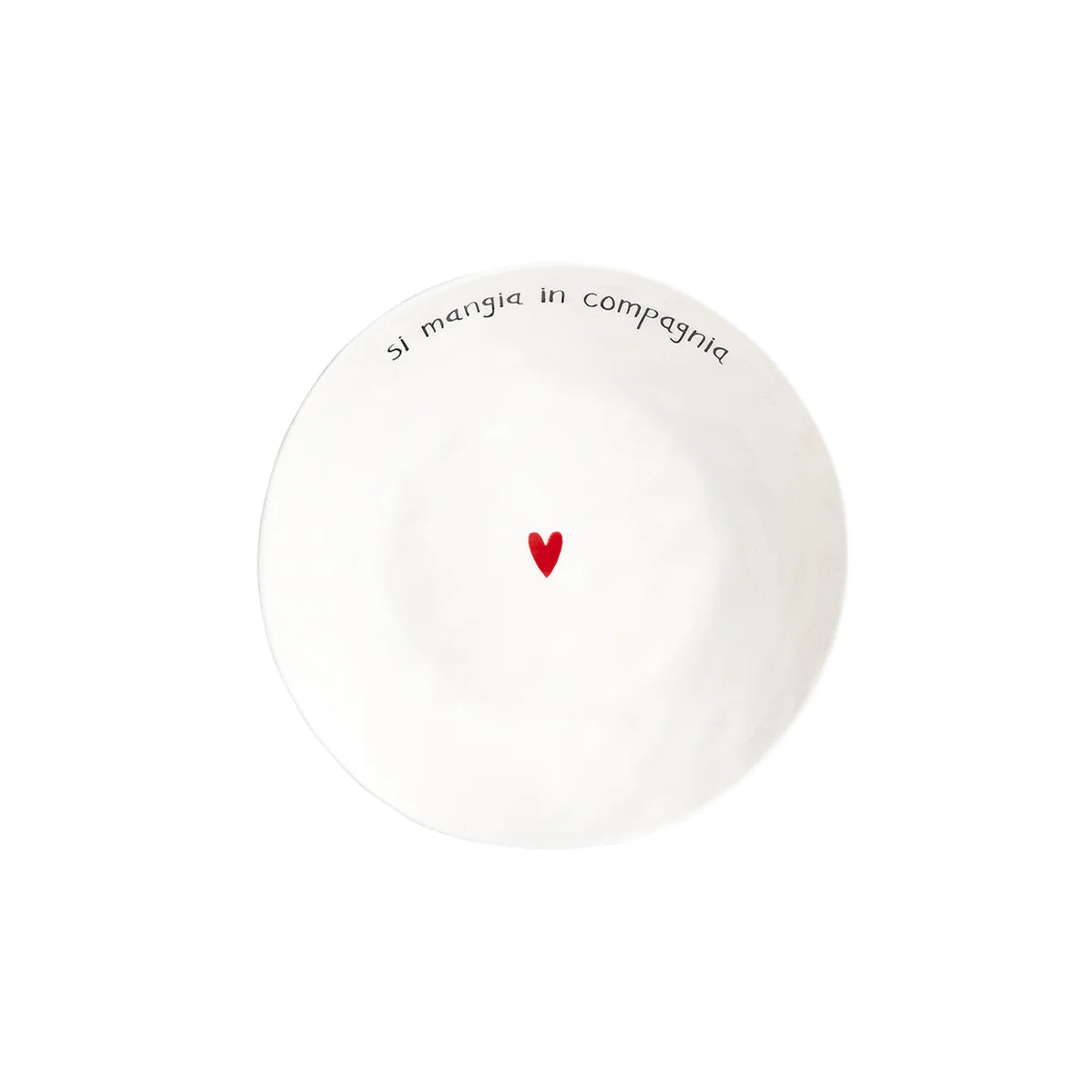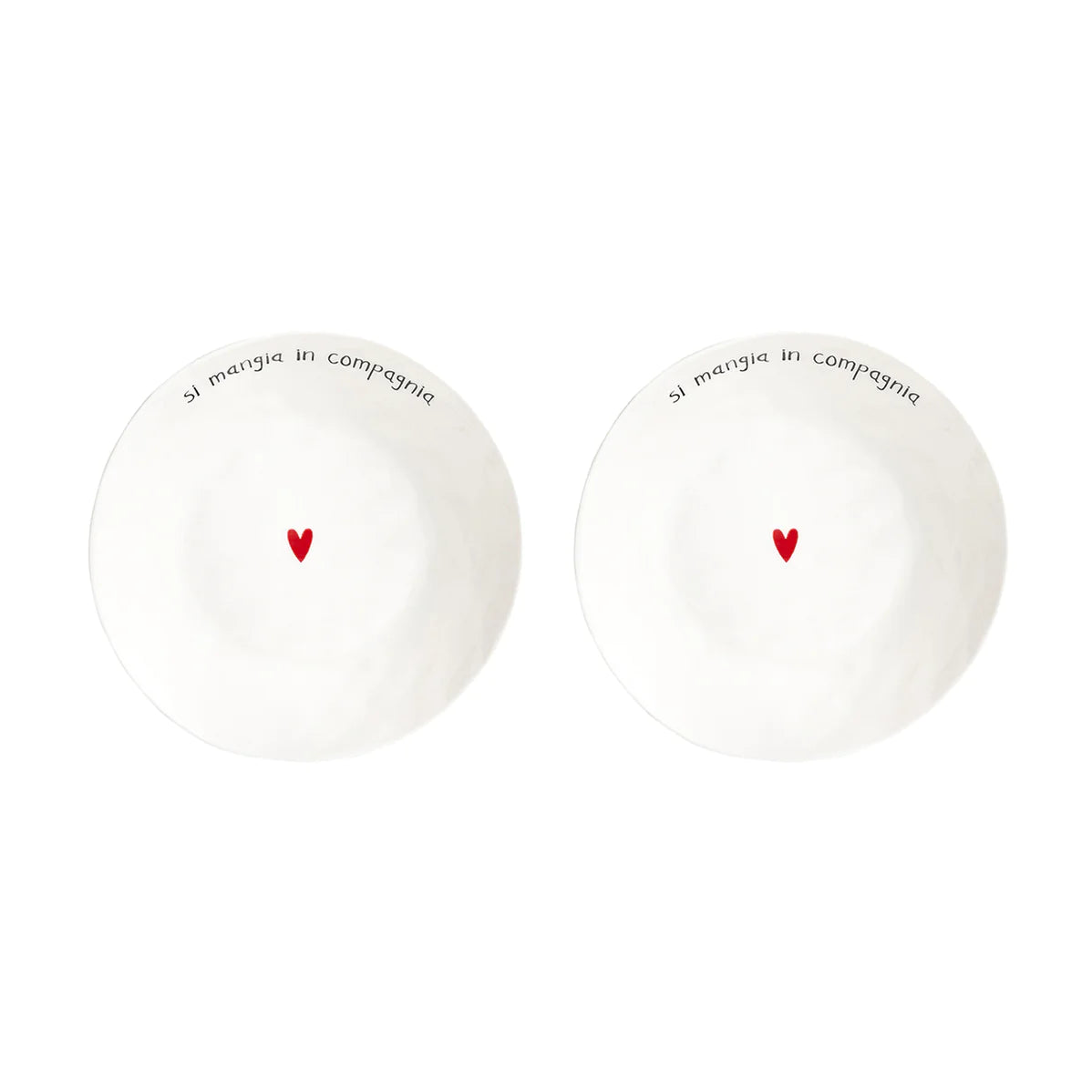 Set 2 piatti fondi bianchi con scritta Si mangia in compagnia in colore nero e cuore rosso.