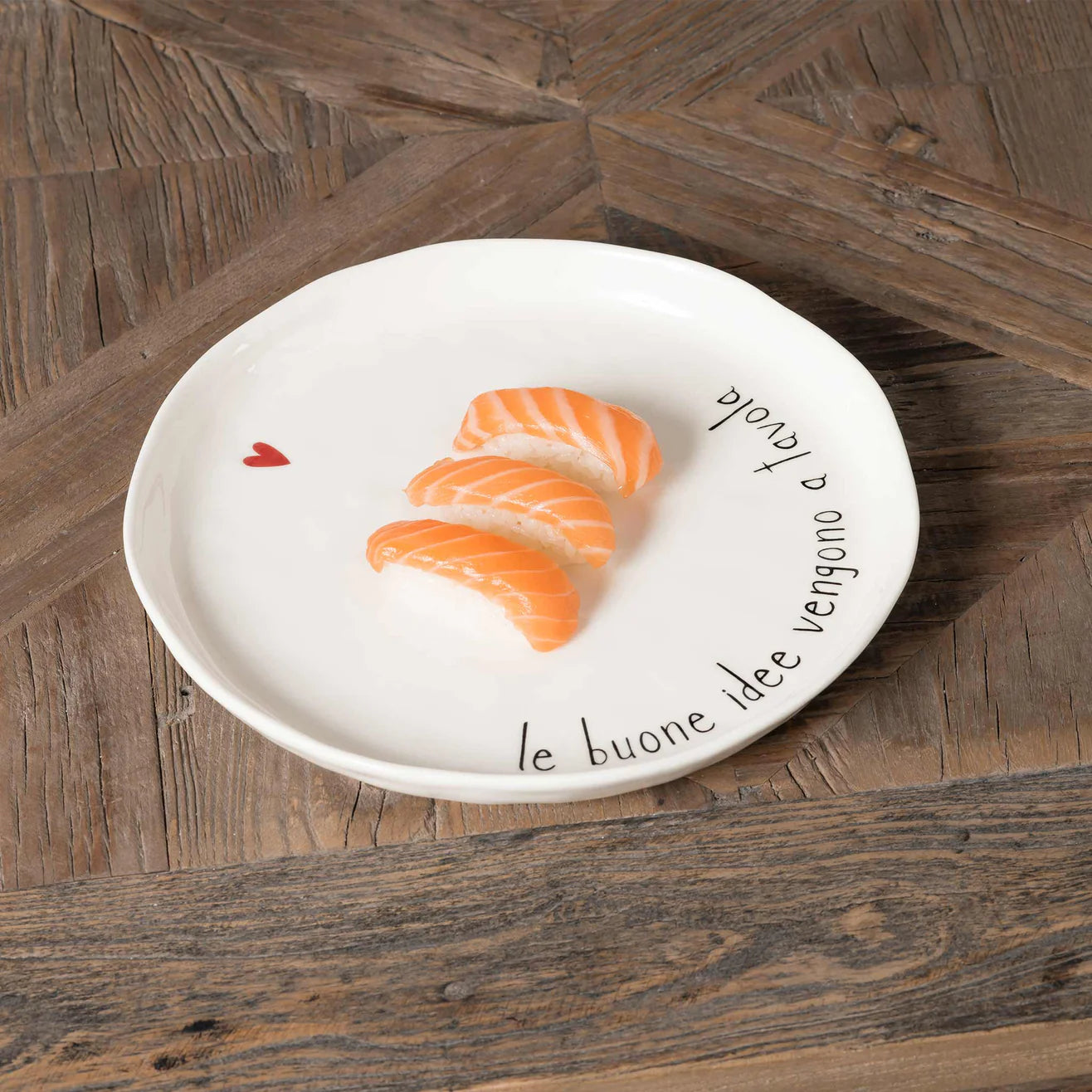 Piatti piano bianco con scritta Le buone idee vengono a tavola in colore nero e cuore rosso.