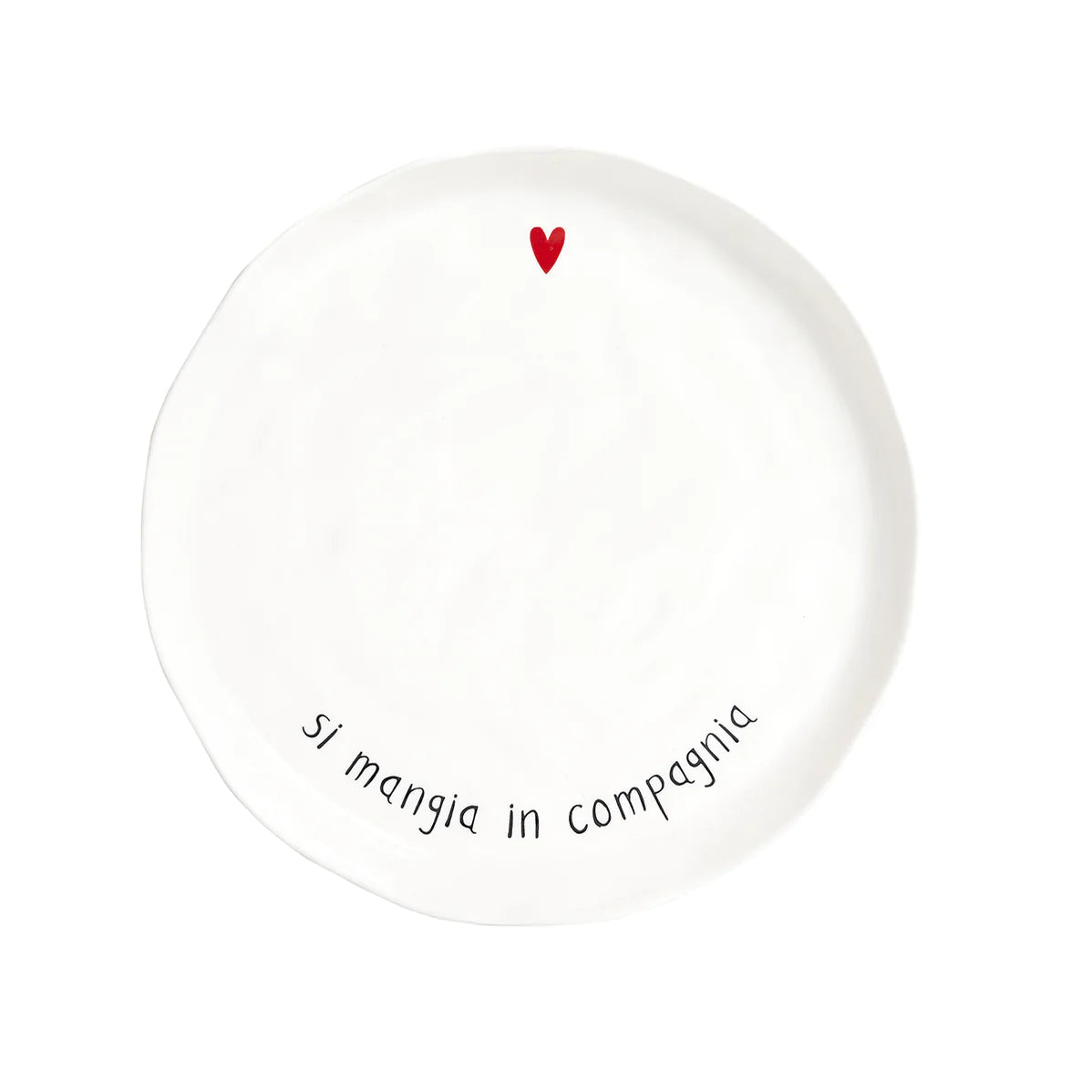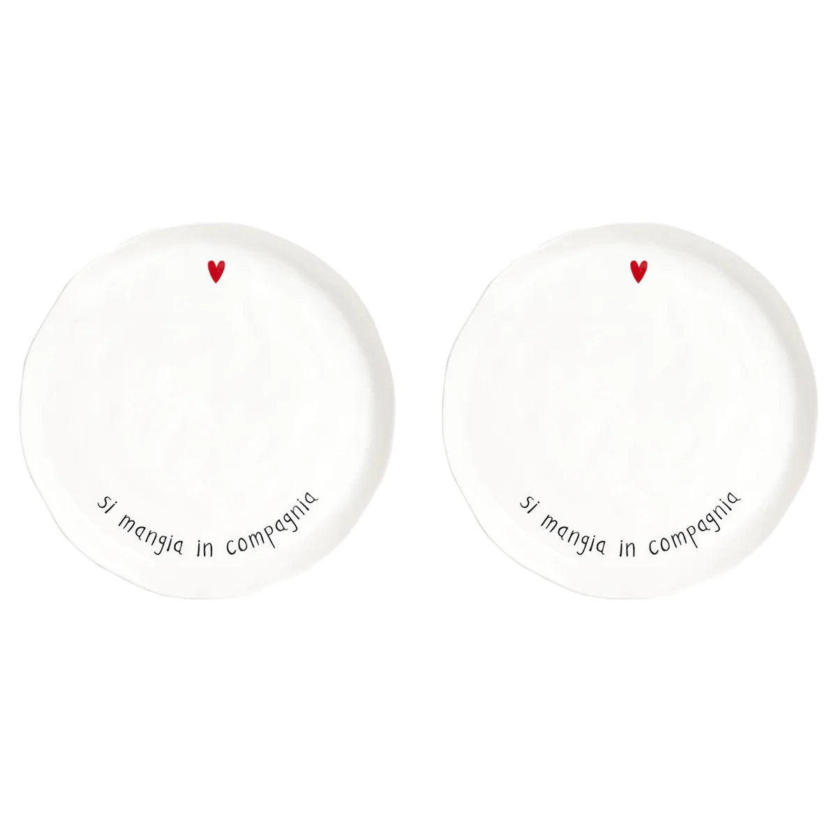 Set 2 piatti piani bianchi con scritta Si mangia in compagnia in colore nero e cuore rosso.