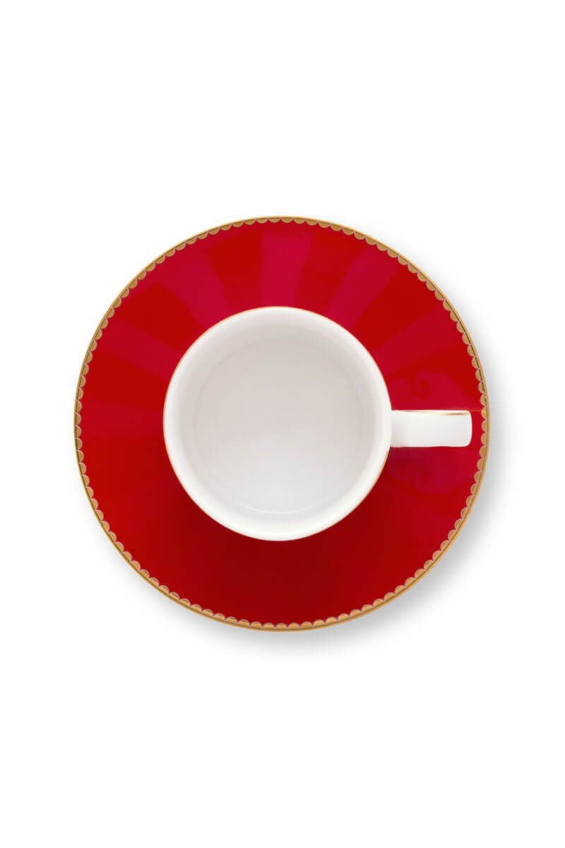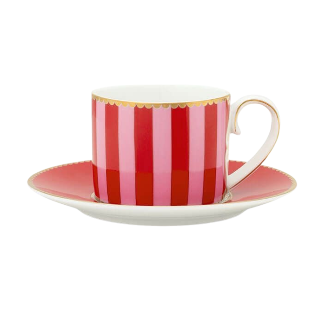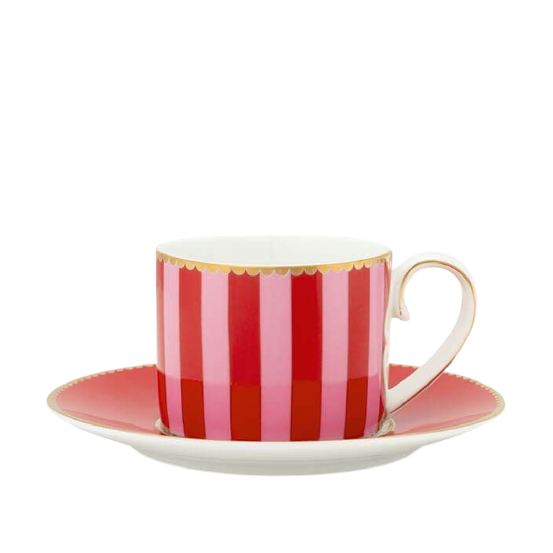 Goditi il tuo caffè con questa elegante tazzina da caffè rossa e rosa a righe verticali, con piatto, della collezione Love Birds di Pip Studio.