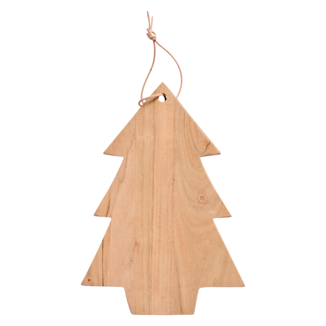 Tagliere a forma di albero realizzato in legno di acacia naturale, con una funzionale corda di pelle per poterlo appendere.
