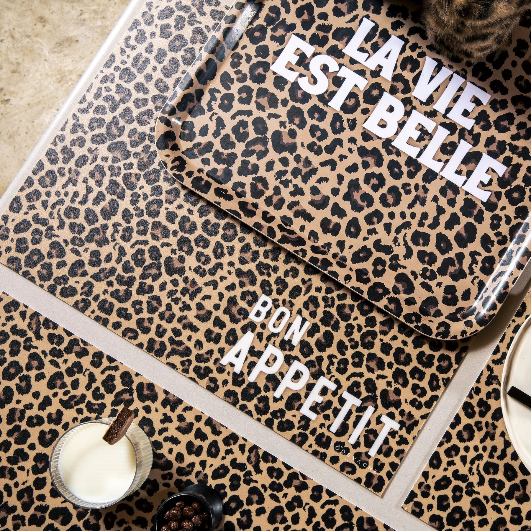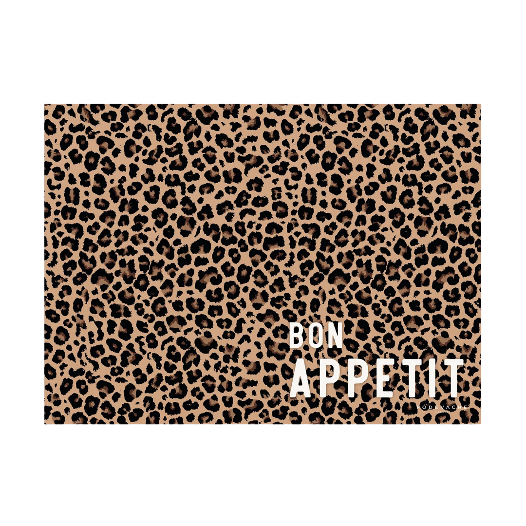 Elegante tovaglietta Olympia di Podevache con stampa leopardo e la scritta Bon Appetit, per rendere la tua tavola indimenticabile, festosa e raffinata, perfetta per qualsiasi occasione.