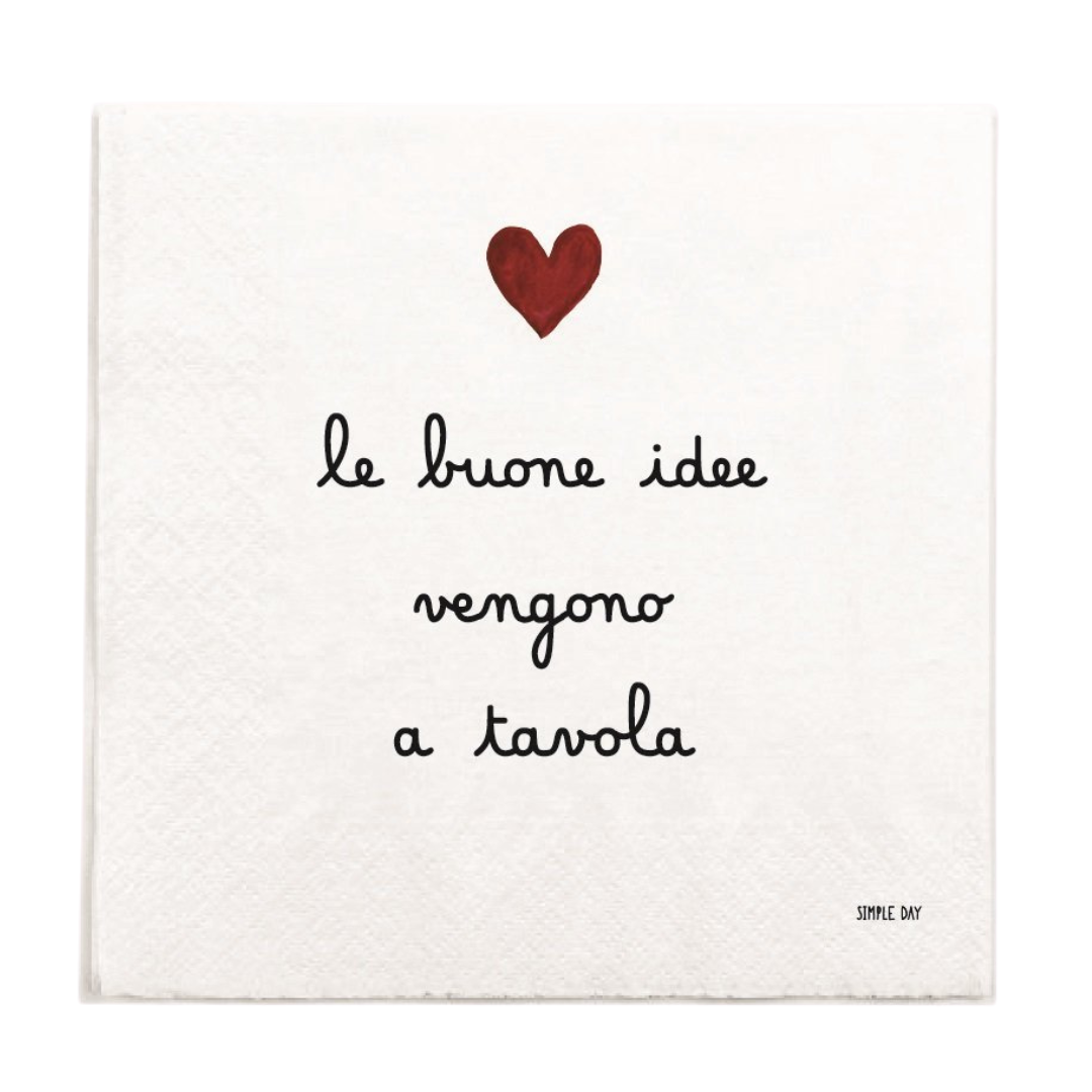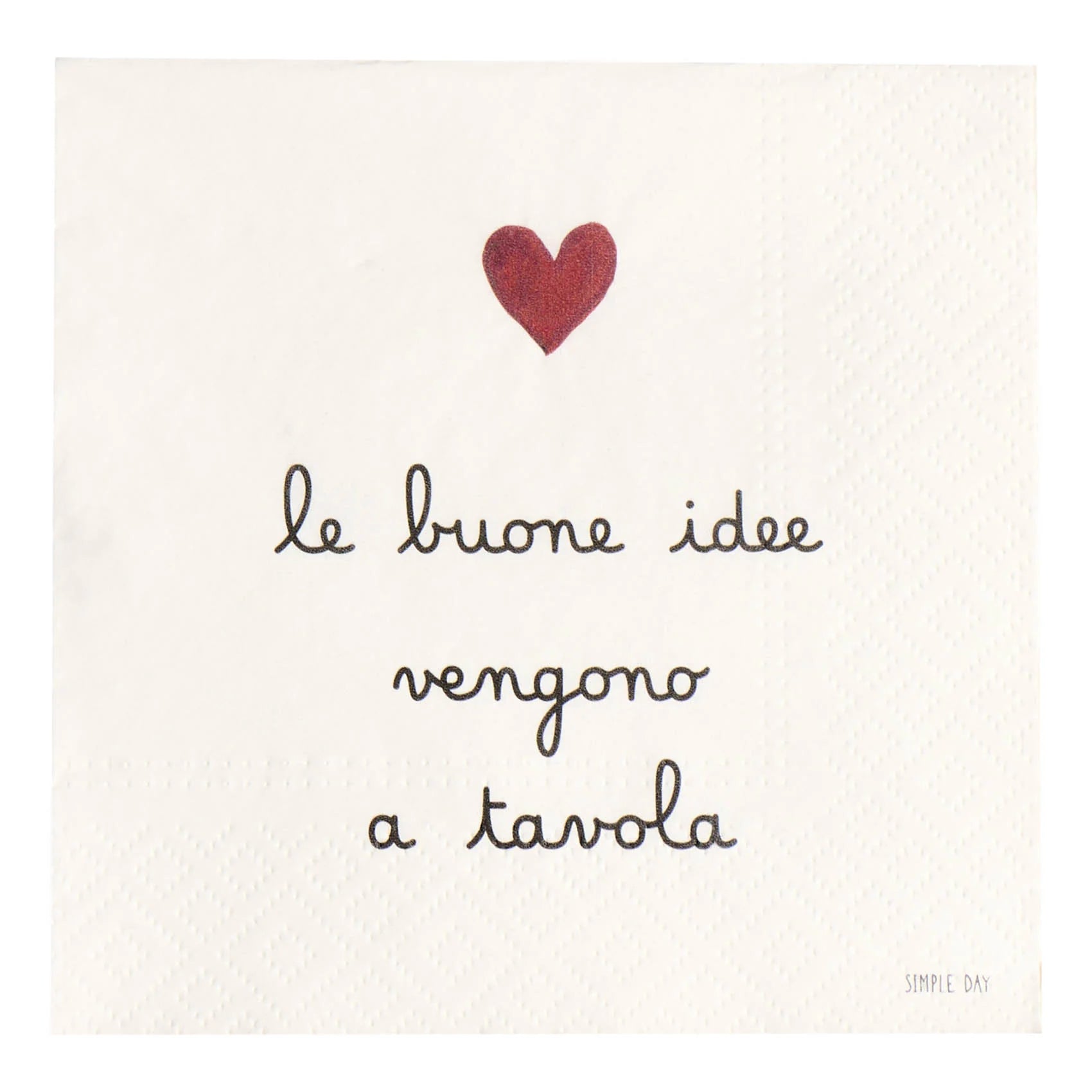 Confezione di tovaglioli bianchi con scritta in nero e cuoricino rosso, di Simple Day.