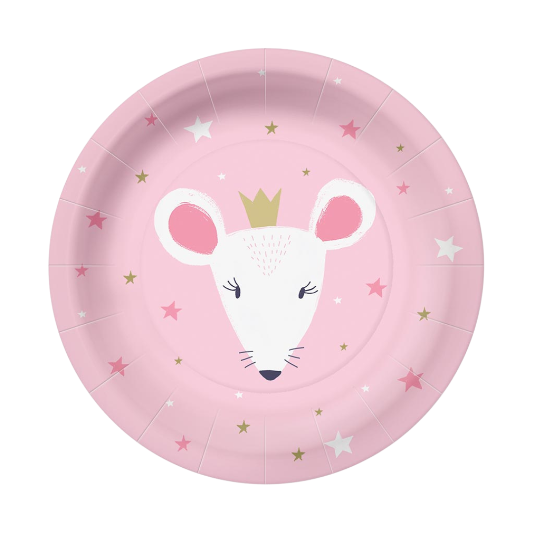 Confezione di 10 piatti tondi monouso in colore rosa con decorato un topolino bianco.
