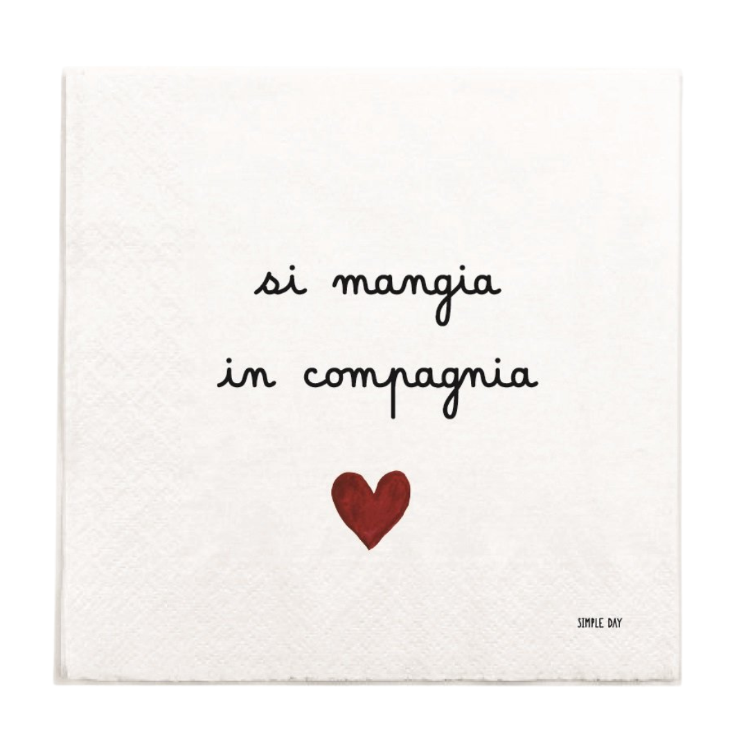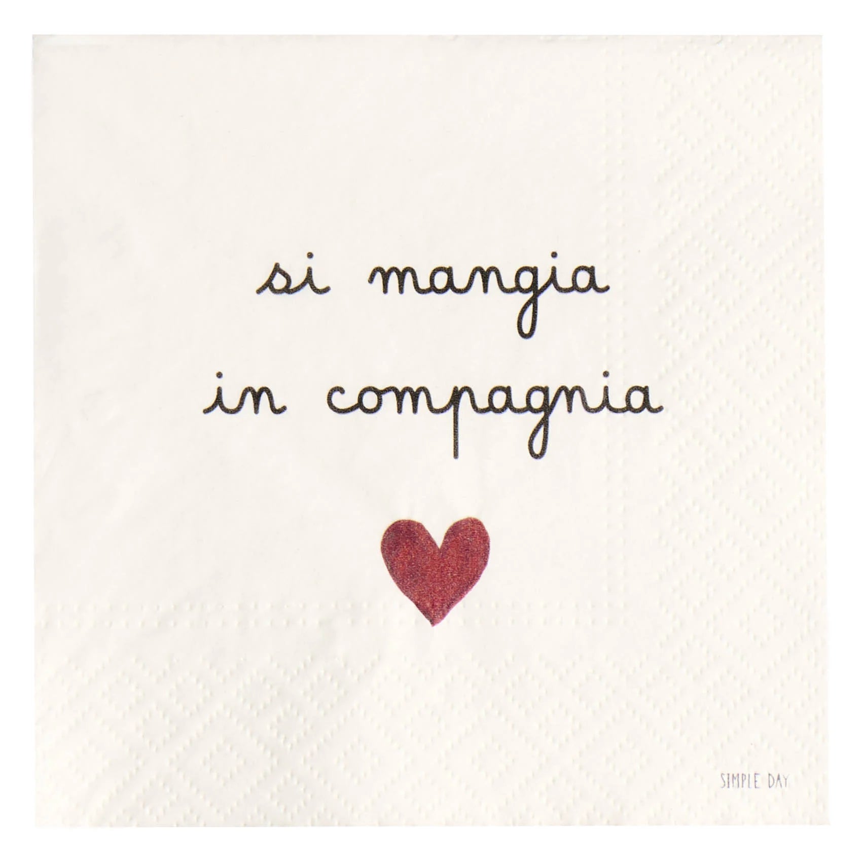 Confezione di tovaglioli bianchi con scritta in nero e cuoricino rosso, di Simple Day.