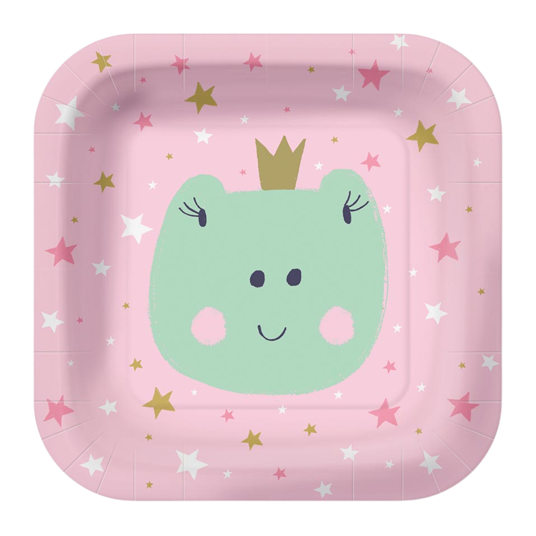 Confezione di 10 piatti quadrati monouso in colore rosa con decoro in verde.