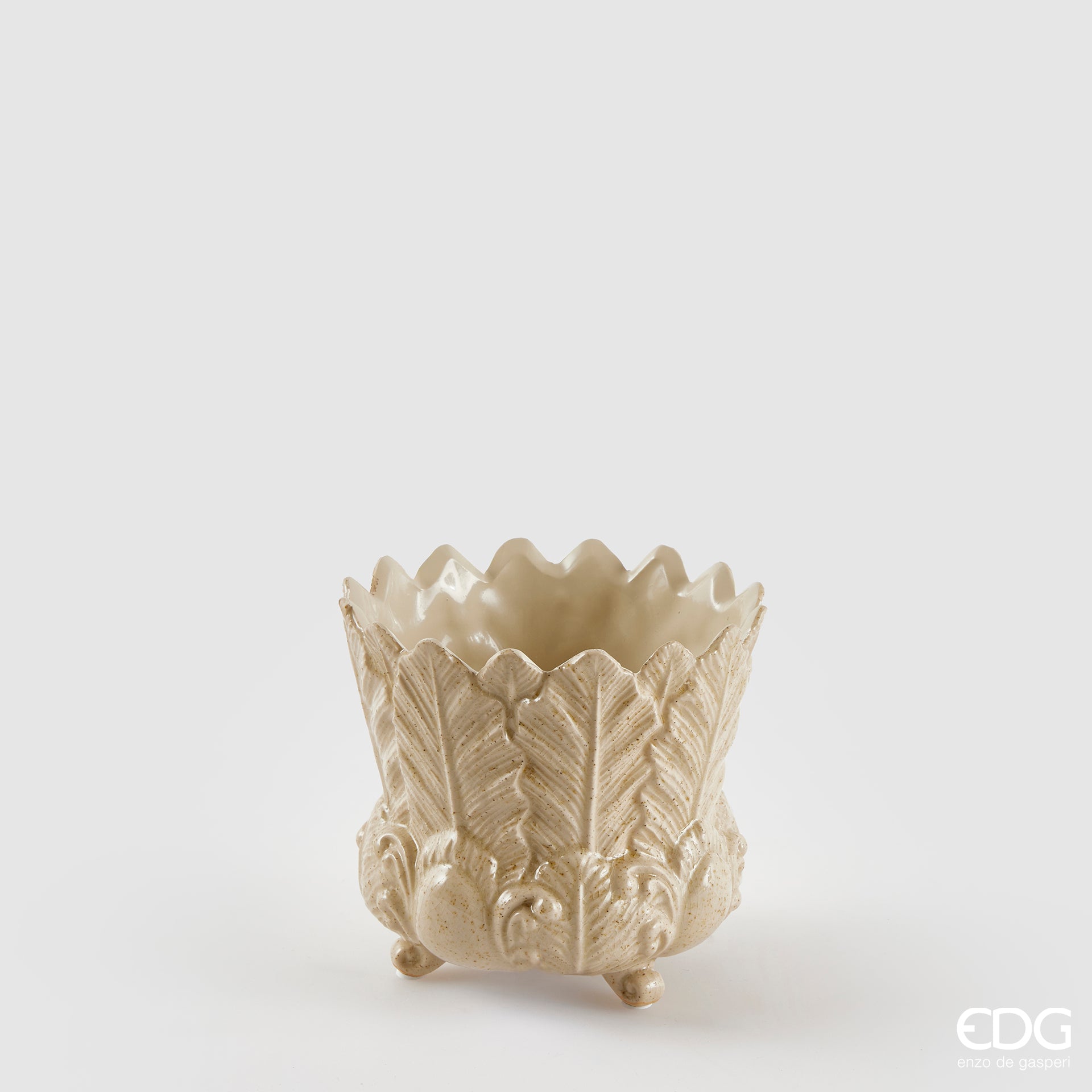 Vaso cachepot con foglie in rilievo, smaltato in colore avorio, di lavorazione artigianale, con piedini.