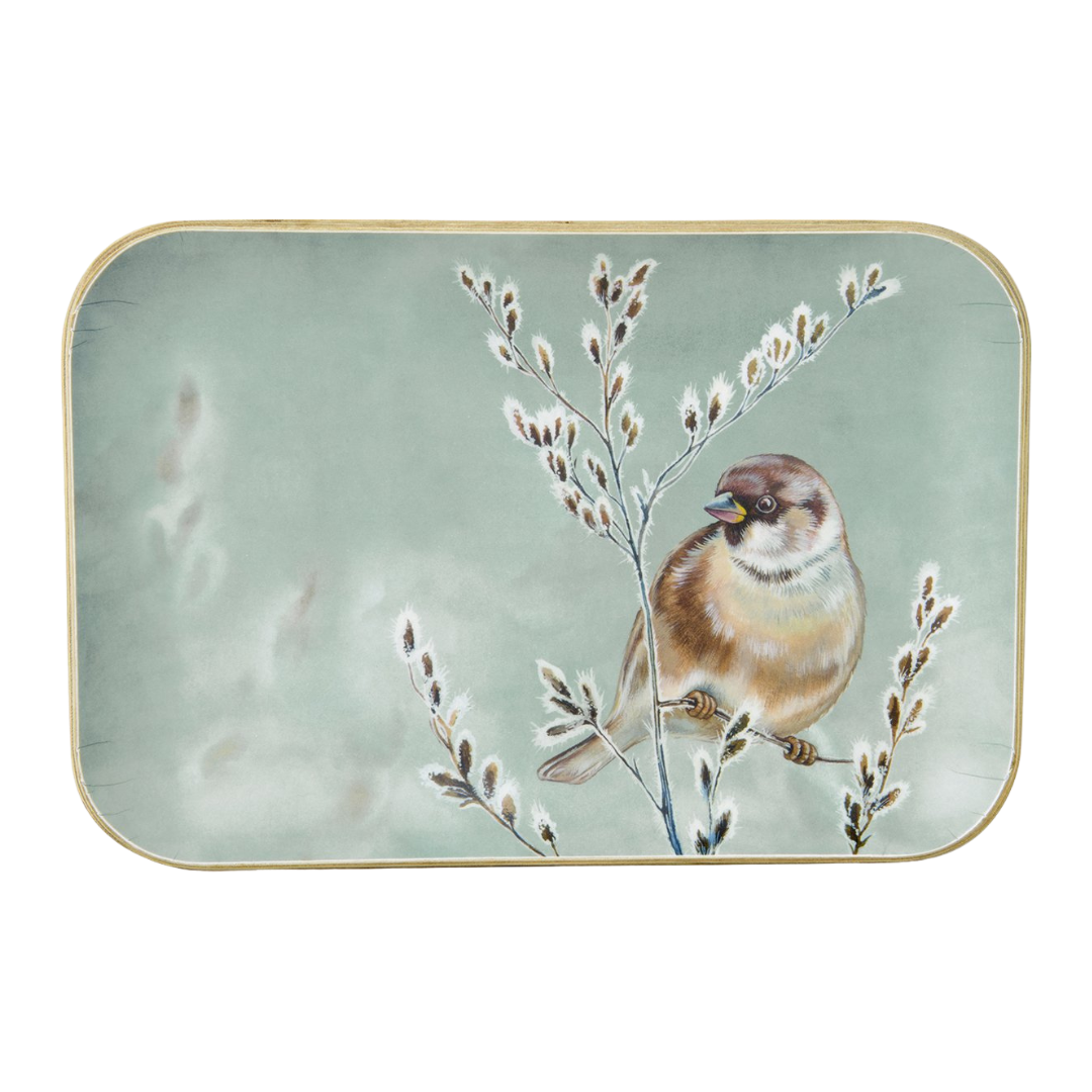 Pratico vassoietto rettangolare con un tenero decoro di un uccellino sulla parte superiore e colore marrone/naturale nella parte sottostante.