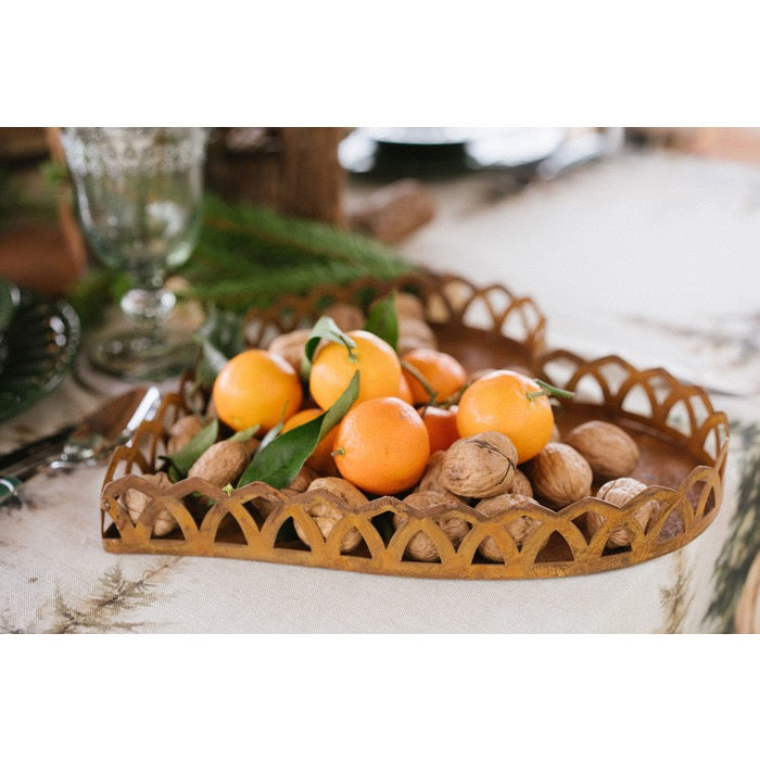 Vassoio in corten, a forma di cuore, con bordo dentellato, della collezione Bosco Incantato di Nuvole di Stoffa.
