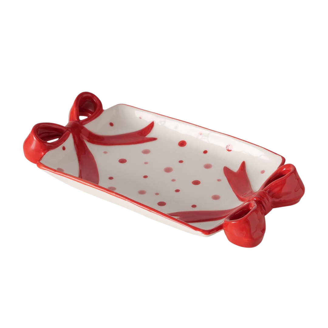 Vassoio rettangolare con ai lati due fiocchi rossi, perfetto per servire ciò che desideri.